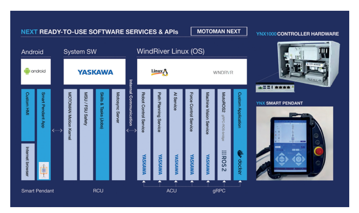 MOTOMAN NEXT integriše klasično upravljanje robotom sa NVIDIA zasnovanim kontrolnim modulom (ACU), nudeći sve mogućnosti iz sveta automatizacije zasnovane na klasičnim signalima (OT ) i sveta IT-a zasnovanog na podacima jedne platforme.