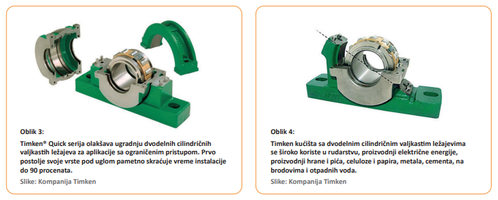 Timken kućišta sa dvodelnim cilindričnim valjkastim ležajevima se široko koriste u rudarstvu, proizvodnji električne energije, proizvodnji hrane i pića, celuloze i papira, metala, cementa, na brodovima i otpadnih voda.